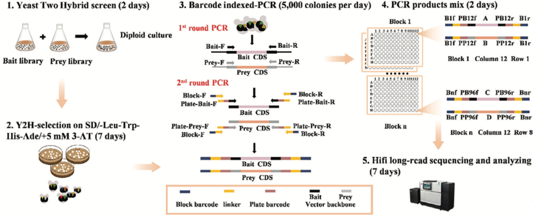 研究人员开发的 BIP-seq(Barcode-indexed PCR Coupled with HiFi Long-read Sequencing)技术利用“库对库(library versus library)”的酵母双杂交策略快速获得数以万计的随机的阳性PPI互作组合酵母克隆。接下来通过两轮 Barcode-indexed PCR 将每个酵母克隆中 Bait 和 Prey 载体上的 cDNA 序列直接扩增,并在序列末端添加 2 套条形码用于判断克隆的来源。最后,通过 HiFi long-read 测序方法将数万个扩增子进行混合测序。具有完全相同的 barcode 的 Bait cDNA 和 Prey cDNA 表明它们来自相同的阳性 PPI 互作酵母克隆,即为互作组合(Fig1)。