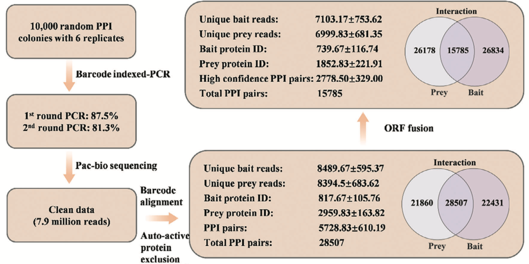 本次实验共设置了 6 个生物学重复,并且每个重复包含 10000 个随机 PPI 克隆。混合 60,000 个 PCR 产物进行 HiFi 长读测序,共获得 7.9 million reads。Barcode-indexed PCR 第一轮和第二轮的效率分别是 87.5%,81.3%。数据过滤后,每重复的有效 bait reads 为 8489.67±595.37,而有效 prey reads 为 8394.5±683.62,匹配的 bait 蛋白数量则为 817.67±105.76,prey 蛋白数量为 2959.83±163.82(Fig3)。