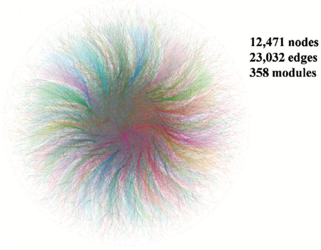 Fig4. The overall picture of RiPPID. The nodes represent proteins in RiPPID; the edges indicate PPI relationships; the modules indicate the nodes were classified in RiPPID with community detection. The various colors represent different modules