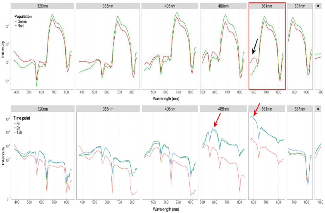 为进一步探究AF与生理状态的密切关系,作者分析了红球藻在不同条件下的光谱特征(图4上)。应激组因积累虾青素而呈红色,其光谱指纹虽在355 nm与405 nm激发下也有轻微差异,但561 nm激发下荧光强度显著升高,最能敏感地反映色素状态的转变。