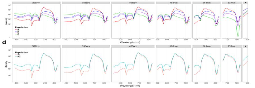 利用Sony ID7000多达7激光184荧光通道和360-920nm全波长覆盖的强大光谱检测配置,研究团队聚焦于团藻目(Volvocales),探索了该目下102株在生态和生理特征上具有多样性的微藻物种,发现R1和R2区域CV值显著高于R3区域(图2c);同时PCA结合k-means聚类分析揭示存在三个显著的AF簇,表明团藻目内部在色素组成和AF强度方面存在明显异质性(图2d)。