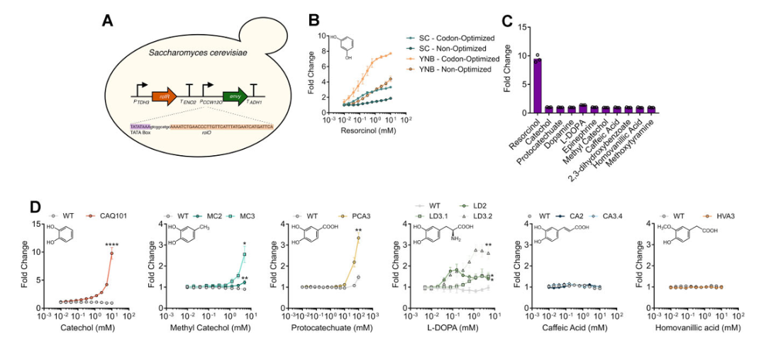 儿茶酚响应变体 CAQ101 在酵母中能产生~10 倍荧光信号,且没有在细菌中出现的“钟形响应”(高浓度下信号反而下降);