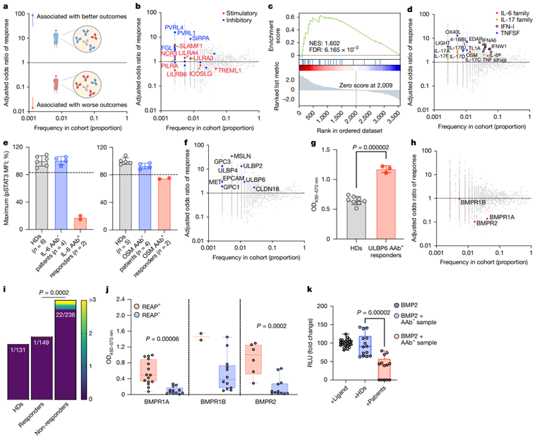 研究团队首次在大规模临床队列(374名接受CPI治疗的癌症患者与131名健康对照)中,运用快速细胞外抗原谱分析技术(REAP),系统性扫描了针对6,172种人类分泌蛋白和膜蛋白的自身抗体(AAb)。研究揭示,癌症患者体内存在一个极其丰富且独特的自身抗体库。这些抗体是显著影响CPI疗效的关键因素。