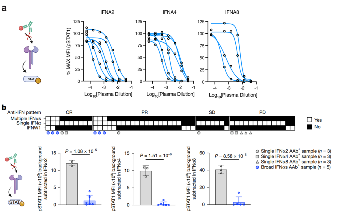 在利用REAP技术鉴定出与疗效相关的自身抗体后,最关键的一步是验证这些抗体是否具有功能性。在此核心环节,SA3800发挥了至关重要的作用。研究显示,在患者自身抗体存在下,特定细胞因子如IFN-I刺激细胞后,下游信号分子(如pSTAT1, pSTAT3)的磷酸化水平显著降低。这些数据直接、有力地证明了:这些自身抗体能够有效中和其靶标蛋白的生物活性。