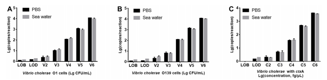 在纯培养溶液中,霍乱弧菌O1、O139和ctxA的检测限(LODs)分别为127.91 CFU/mL、120.23 CFU/mL和1.5拷贝/反应,而海水样品中三个靶标的LODs分别为150.66 CFU/mL、147.57 CFU/mL和2拷贝/反应。