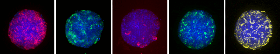 HepaRG NP 3D 模型用 DAPI(蓝色)标记,从左到右分别为 Albumin(红色;肝细胞)、pan-cytokeratin(绿色;胆管细胞)、CD31(红色;肝内皮细胞)、CD68(绿色;Kupffer 细胞)、Vimentin(黄色;肝星状细胞)(Visikol 官网)。