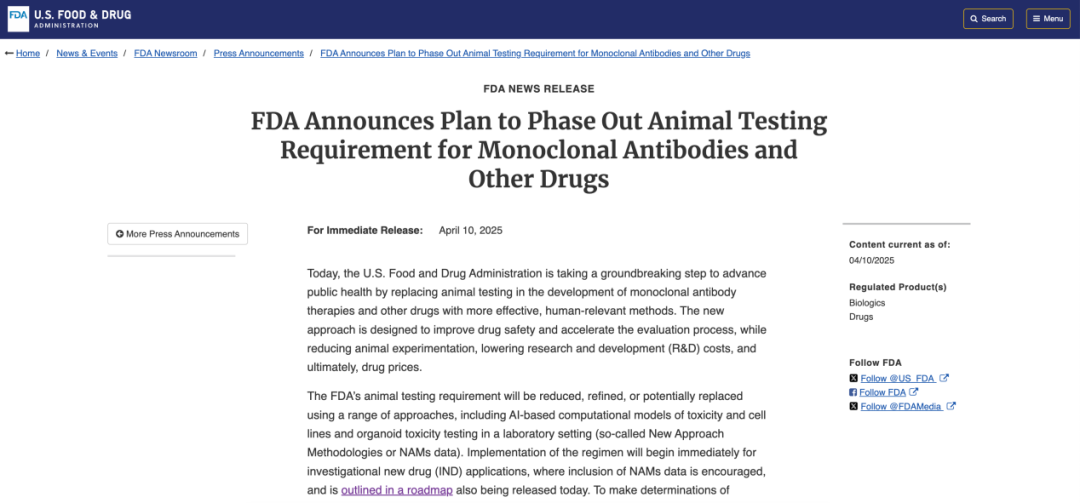 全球新药研发正迎来一场深刻变革。过去以动物实验为主的研发体系,正在被更接近人体生理状态的新方法取代。2025年4月10日,美国FDA发布重要新政,明确提出将逐步减少药物临床前安全性研究中的动物试验,转而采用更先进、更人性化的“新方法学”(New Approach Methodologies, NAMs)。此措被视为继2022年《FDA现代化法案2.0》之后,美国在新药研发流程中的又一次重大突破。