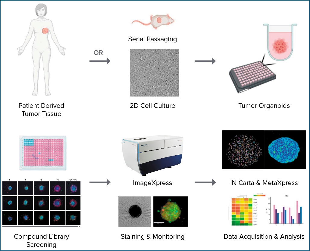 Fig 2. Schematic diagram of the experimental workflow including generation of patient-derived cell line, formation of tumoroids in 384 well U-shape low attachment plates, compound treatment, staining, imaging and analysis [7]