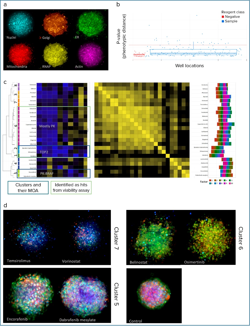 Fig 3.The Cell Painting assay modified for 3D spheroids. A) Spheroids were labeled with phalloidin,MitoTracker, WGA, SYTO 14, concanavalin A and Hoechst 33342. B) Scatterplot representing the phenotypic distance score for each compound is shown. C) Results of cluster analysis are represented as a hierarchical dendrogram. D) Example images grouped by cluster from the Cell Painting assay