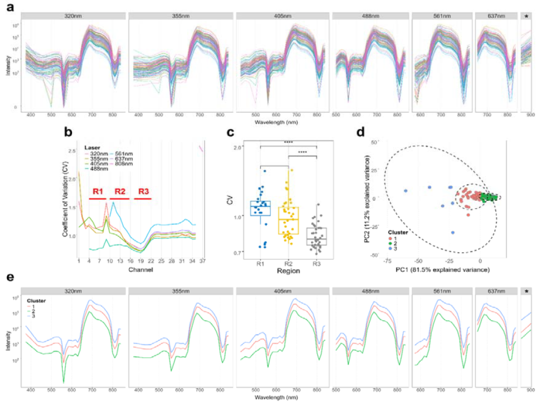 利用Sony ID7000多达7激光184荧光通道和360-920nm全波长覆盖的强大光谱检测配置,研究团队聚焦于团藻目(Volvocales),探索了该目下102株在生态和生理特征上具有多样性的微藻物种,发现R1和R2区域CV值显著高于R3区域(图2c);同时PCA结合k-means聚类分析揭示存在三个显著的AF簇,表明团藻目内部在色素组成和AF强度方面存在明显异质性(图2d)。