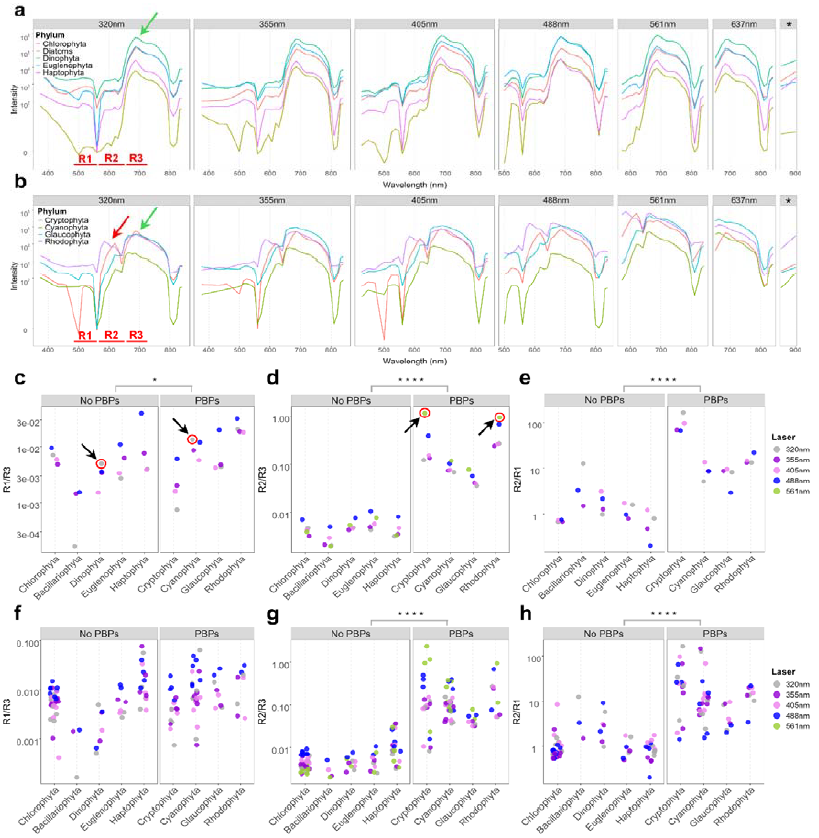 是否表达藻胆蛋白(PBP),是微藻谱系分类的重要标志。作者通过分析来自9个主要微藻类群的32个代表性物种的AF光谱,发现含PBP类群(包括蓝藻、隐藻、红藻和灰藻)与不含PBP类群(如绿藻、硅藻、定鞭藻、裸藻和甲藻)在570–600 nm范围存在显著光谱特征差异,对应于藻蓝蛋白和藻红蛋白的发射峰。并通过定义三个目标光谱区域R1(494–566 nm)、R2(566–647 nm)和R3(647–712 nm)),量化光谱差异,验证含PBP类群在R2区域表现出更高的荧光强度,表明其可作为可靠的分类特征。