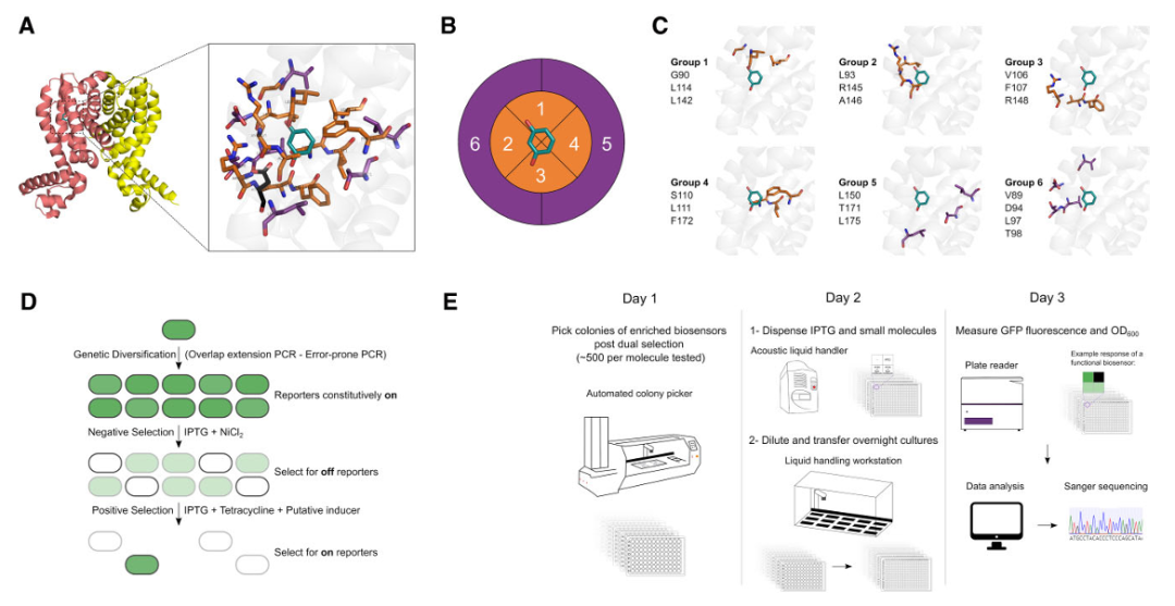 RolR 通过“配体结合口袋”识别底物间苯二酚,口袋的形状和氨基酸组成决定其能结合的分子种类。研究人员筛选出 19 个位于口袋内或附近的关键氨基酸。通过“组合活性位点饱和测试(CAST)”和“迭代饱和诱变(ISM)”技术,对这些氨基酸进行精准突变,创造海量 RolR 变体(图 1.A-C)。值得注意的是,研究人员特意保留氨基酸 D149——这是 RolR 识别间苯二酚的“关键抓手”,突变会导致其完全失去功能。