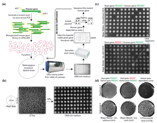 尽管作者之前用于识别酵母基因的人类基因替代型变异的筛选策略取得了成功,但该策略繁琐且仅鉴定出 2 个抑制子(Kachroo 等人,2015 年)。该技术需要人工分离菌落,然后进行四分体分离,而且鉴定抑制子需要人工筛选数百个酵母菌落。因此,作者开发了一种新的流程,以自动化高通量的方式筛选抑制子质粒(图 1a)。