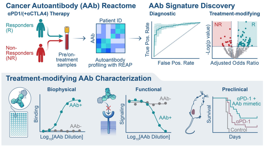 研究团队首次在大规模临床队列(374名接受CPI治疗的癌症患者与131名健康对照)中,运用快速细胞外抗原谱分析技术(REAP),系统性扫描了针对6,172种人类分泌蛋白和膜蛋白的自身抗体(AAb)。研究揭示,癌症患者体内存在一个极其丰富且独特的自身抗体库。这些抗体是显著影响CPI疗效的关键因素。