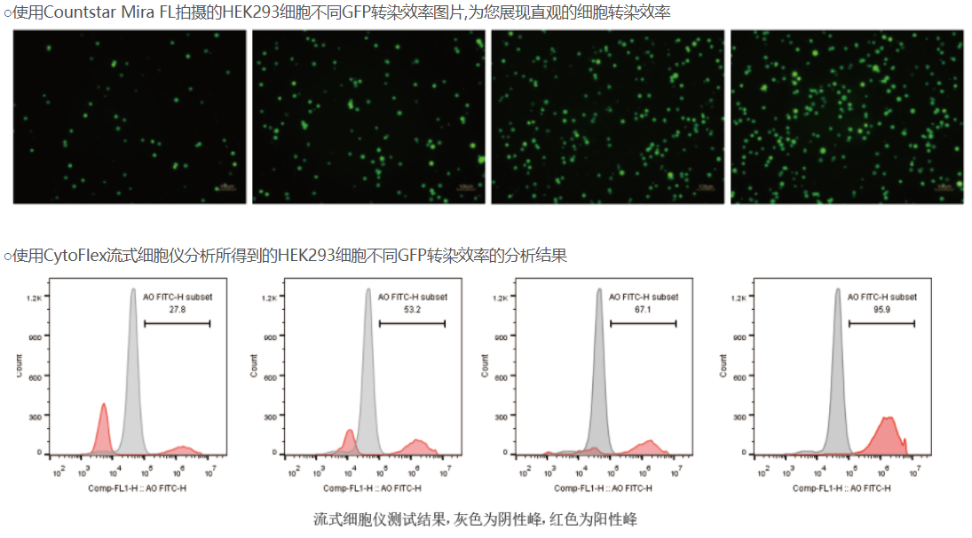 转染效率作为细胞株开发和筛选、病毒载体开发与大规模生产的重要环节,已成为制约药物开发的关键因素之一,因此,高效便捷的定量检测,提升细胞或病毒的转染效率,就成为基因治疗行业亟待解决的问题。 使用Countstar Mira FL细胞分析仪不仅可得到媲美流式细胞分析仪的精准定量检测结果,还可获得基于图像的细胞分析结果, 提升转染效率的同时,简化和加速病毒载体开发与生产的流程,助力基因治疗药物的研发和商业化进程。